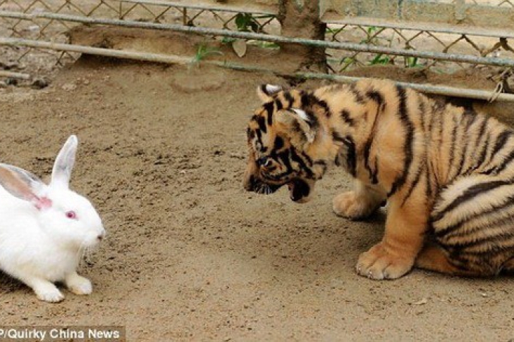 Китайский зоопарк Циндао (Qingdao Forestry Zoo), что на востоке провинции Шаньдун (Северный Китай), решил провести эксперимент, подсадив белого кролика в вольер к двухмесячным детенышам тигра и леопарда, пишет zoopicture.ru.