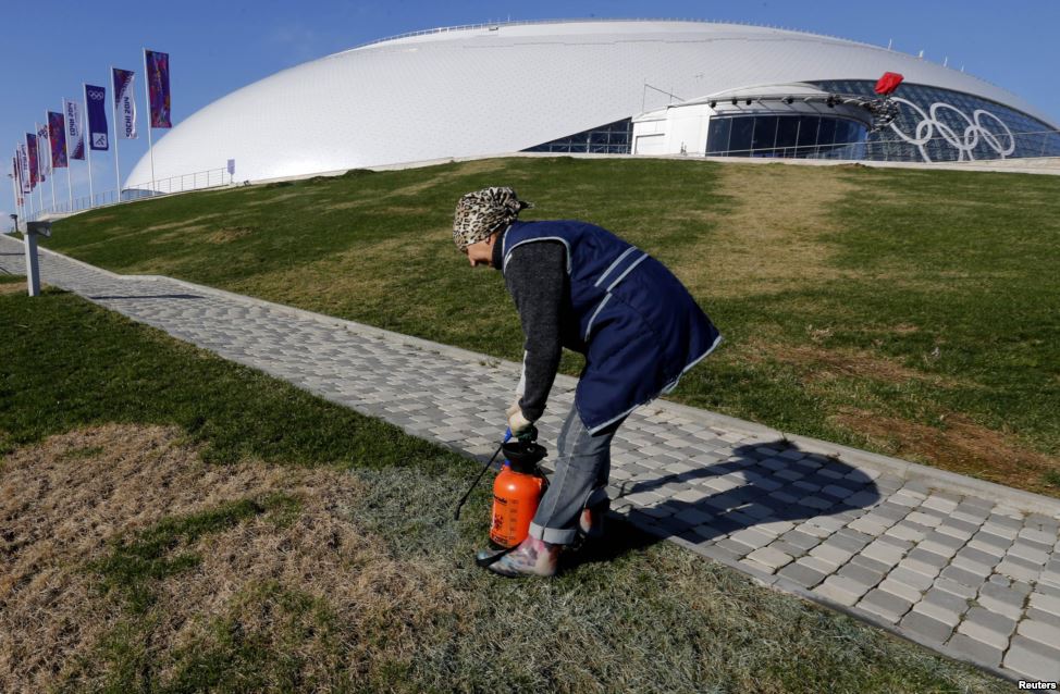 Рабочие в спешке разбирают строительный мусор, подметают улицы и аллеи и даже красят траву в зеленый цвет, сообщает «Радио Свобода» (фото - 4 и 2 февраля).
