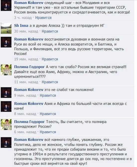 Представитель Российской Федерации в Совете Европы Роман Кокорев в Facebook заявляет о том, что в состав России вернется территория Молдавии, Украины, остальных республик бывшего СССР, а также Аляски, стран Балтии, Финляндии и Польши.