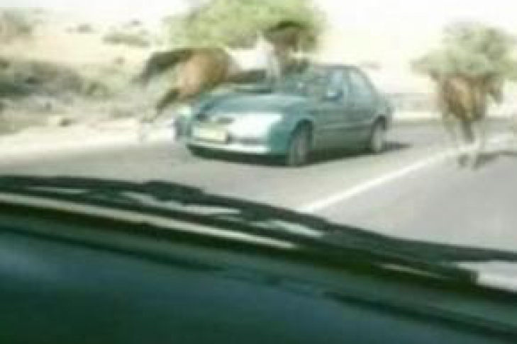 Туристам в Галилее (Израиль) удалось стать свидетелями необычного дорожного происшествия. Как сообщают местные СМИ, лошадь не захотела уступить дорогу автомобилю, едущему по дороге, и прыгнула на него. На самом деле, лошадь, которая бежала по дороге с тремя своими «коллегами», хотела перепрыгнуть попавшийся на пути автомобиль, но не рассчитала своих сил.