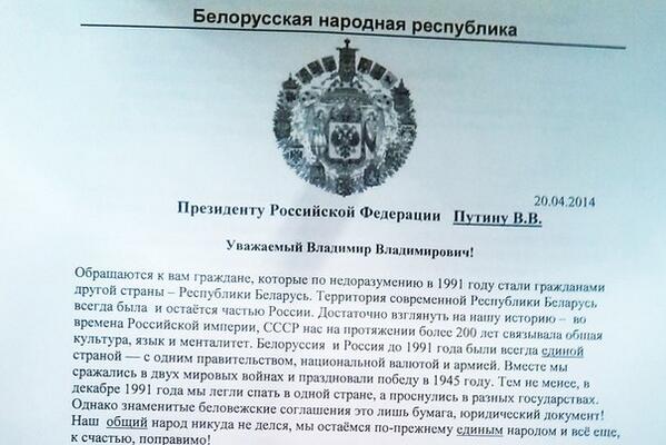То, что происходит в Украине, началось и в Беларуси. Никому не известные «русскоязычные граждане» Беларуси написали Путину письмо, где попросили его помочь воссоединить народы под крышей Российского государства. Ниже приводится фото письма, которое рассылается по социальным сетям.