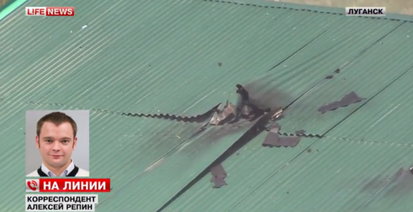 В момент, когда корреспондент Lifenews Алексей Репин рассказывал по телефону о том, украинский военный самолет обстрелял здание ОГА, в эфире показывались кадры, на которых в крышу некоего здания попадает выпущенный откуда-то сверху снаряд. Далее в сюжете показали горящий на земле грузовик и мирных жителей (в основном женщин), которые убегают от некой угрозы.