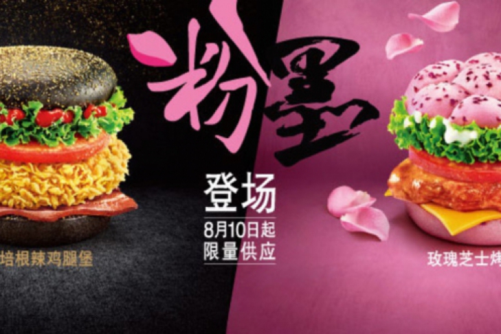 Сеть фаст-фуда KFC в Китае предлагает два новых бургера - с булочками черного и розового цветов