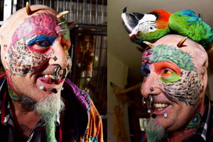 56-летний Тед Ричардс из британского города Бристоль посвятил свою жизнь тому, чтобы стать похожим на попугая. Бывший работник местной обувной фабрики, который держит дома пять попугаев, игуану и собаку, покрыл все свое тело татуировками и сделал вызывающий пирсинг.