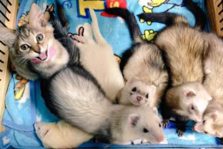 Сеть заполонили фотографии трогательного полугодовалого котенка Комари, которого неназванные граждане Японии подобрали на улице и поселили вместе с живущими у них дома хорьками. Те полюбили новичка, и теперь животные неразлучны, сообщает Metro.