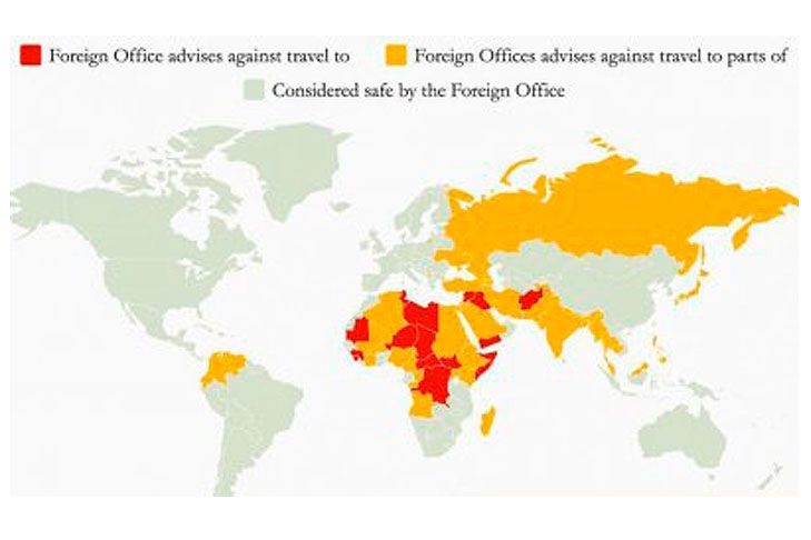 Издание The Independent совместно с сервисом Statista, основываясь на данных, предоставленных МИД Великобритании, составило карту самых опасных регионов для посещения их туристами.