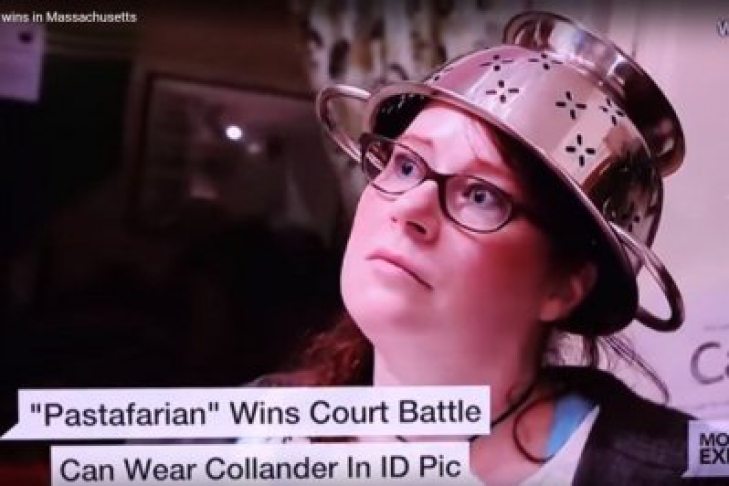 Дело в том, что американка Линдсей Миллер является сторонницей пародийной религии - пастафарианства, а также ее еще именуют церковью летающего макаронного монстра. Девушка попросила разрешение сфотографироваться с дуршлагом на голове, как того требует ее религия, однако получила твердый отказ. Так как такой ответ женщину не устроил она решила обратиться в суд.
