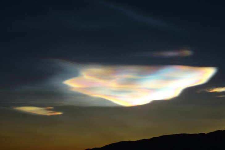 Также известные как «перламутровые» облака эти ледяные структуры, состоящие из мелких кристалликов водяного льда и азотной кислоты, образовываются в нижней стратосфере, когда температура падает до −85 °С. Солнечный свет, проникая сквозь кристаллики льда размером до 10 мкм, производит характерные яркие радужные цвета от дифракции и интерференции. В настоящее время стало известно, что появление таких облаков связано с разрушением озона.