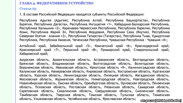 Отмечается, что при этом в тексте Конституции России на сайте Кремля в статье 65 Крым уже упоминается как субъект Российской Федерации. В списке республик Крым указан вслед за Республикой Коми. В этом перечне уже 22 республики.