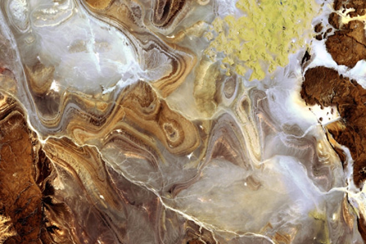 Японский спутник ALOS увидел необычные пейзажи в страшном регионе Сахары - там нет ни растительности, ни воды. Зато там поистине удивительные ландшафты. Это каменные горы (бурый цвет), соляные равнины (белый цвет). А вот желтые неровности в правой верхней части - это песчаная пустыня (эрг) Мехеджибат, конгломерат маленьких дюн.