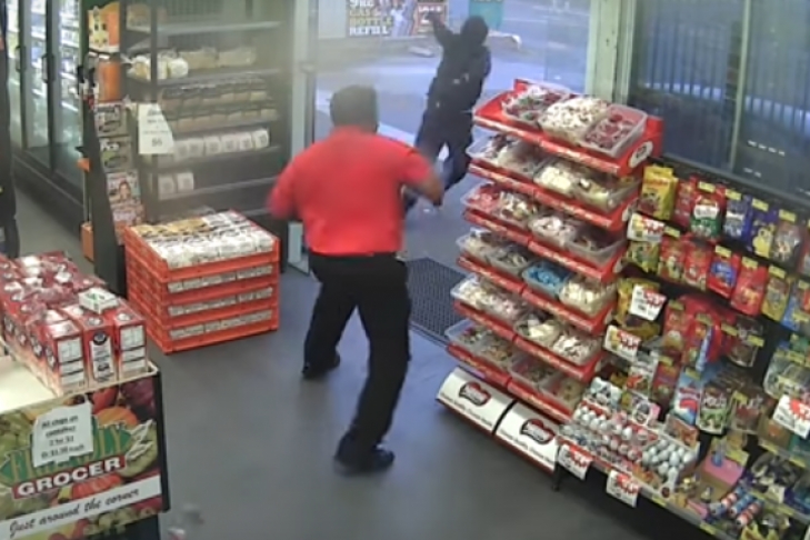 Камера в магазине сняла, как 2 грабителей в черных балаклавах хотели ворваться в магазин. Заметив это, работник минимаркета начал бросать в них конфетами из коробки.