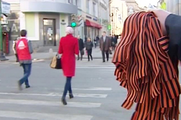 Водители сообщают, что вместо "георгиевских лент" им "добровольно-принудительно" рекомендовали красно-зеленую ленту с цветком яблони, которая должна символизировать май 1945 года.