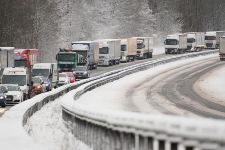 На некоторых дорогах страны образовались многокилометровые пробки, а в аэропорту Франкфурта-на-Майне из-за сильного ветра и снегопада отменили более 100 рейсов.