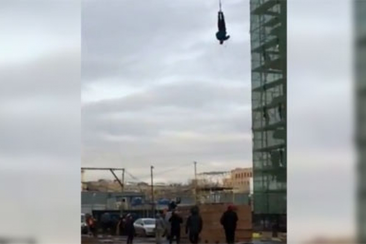 На кадрах видно, что мужчина прыгает со стрелы крана и летит вниз головой с высоты несколько десятков метров. Позже слышится глухой стук, в это время каскадер касается головой о землю.