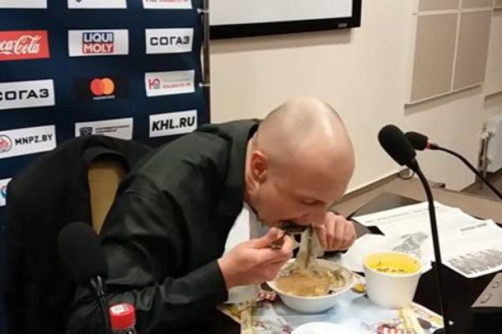 Федоренков исполнил свое обещание. После завершения матча "Динамо-Нефтехимик" он съел газету "Прессбол" в пресс-центре Минск-Арены.
