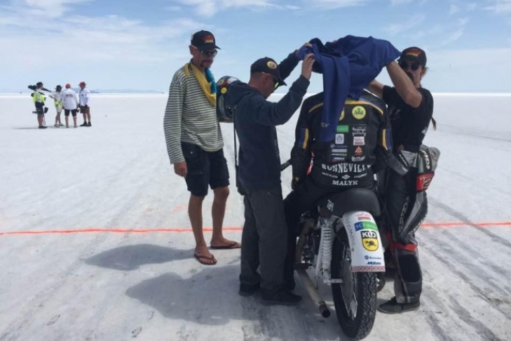 Доработанный мотоцикл КМЗ «Днепр» показал максимальную скорость 73,041 мили в час (116,86 км/ч), побив тем самым предыдущий рекорд в данном классе — 51 миль в час (82,2 км/ч). Следует напомнить, что, по сравнению с асфальтом, на соляном покрытии, развить ту или иную скорость сложнее.