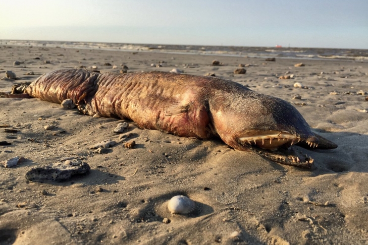 В Техасе (США) после урагана "Харви" на пляже нашли загадочное животное без глаз и с острыми зубами. Фото неизвестного существа опубликовала в Twitter биолог Прити Десай.