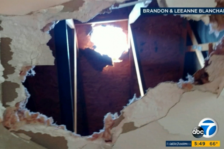 "В доме находилась жена, она сказала, что у нас произошел взрыв или что-то вроде того", — рассказал Брендон Бланшар. Он добавил, что в крыше над ванной образовалась огромная дыра.