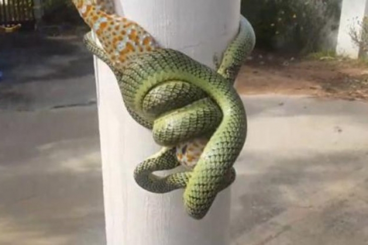 На записи видно, как геккон, сидящий на столбе, укусил и не выпускает змею, а та отвечает удушающим приемом, набросив хвост на шею противника.