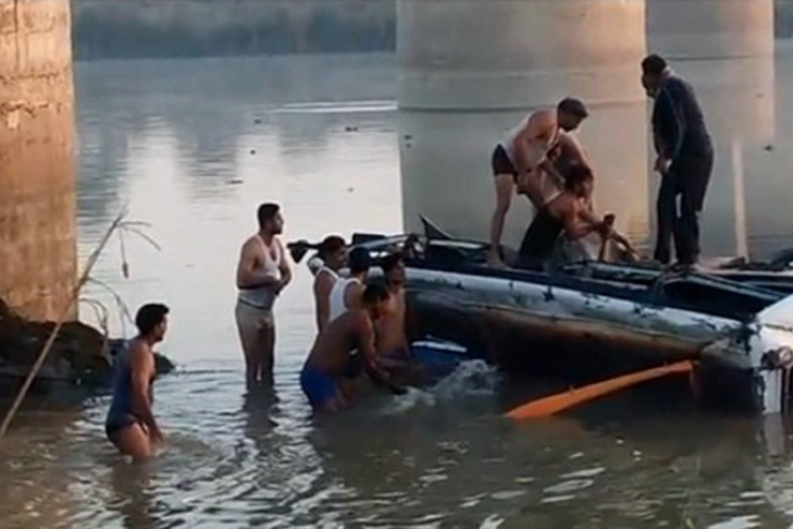 По данным полиции, пассажирский автобус, ехавший на высокой скорости из города Савай-Мадхопур в Лалсот, пытался обогнать автомобиль на мосту, но его водитель не справился с управлением.