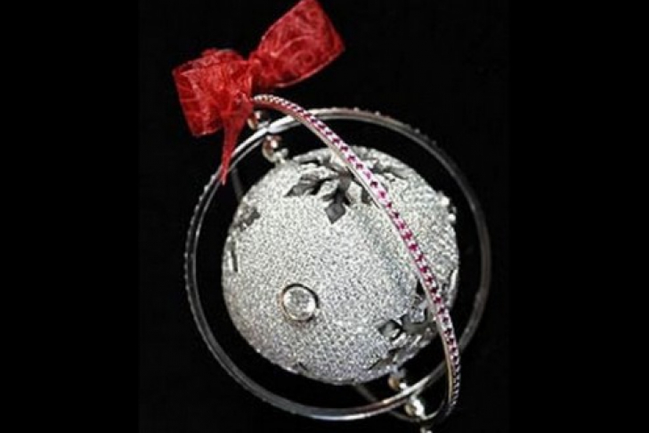 Украшение изготовили в Британии из белого золота 750-й пробы и украсили 1578 бриллиантами. Опоясывают шар два кольца, усыпанные рубинами.