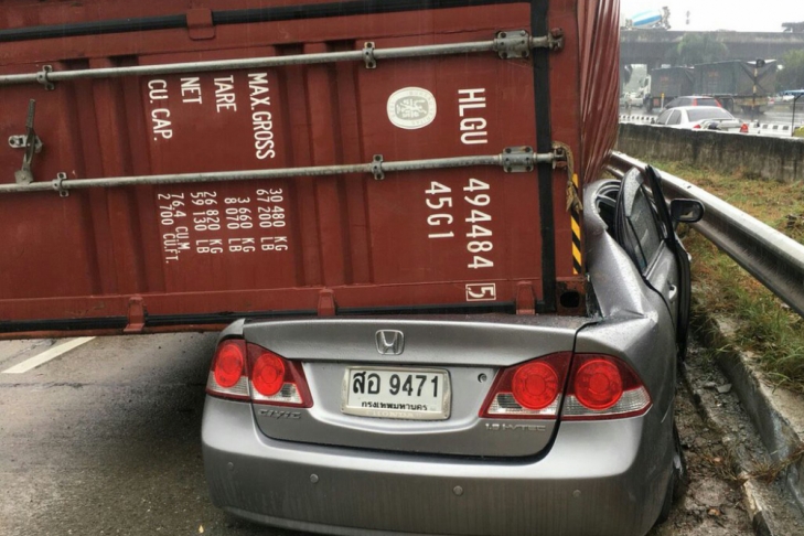 В Таиланде водитель легкового автомобиля чудом избежал смерти, когда на его машину рухнул контейнер с проезжавшего мимо грузовика. Об этом сообщает Nation.