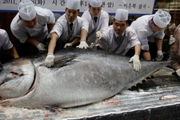 На рыбном рынке Цукидзи в Токио продали голубого тунца весом 405 кг за 36 млн йен ($323 тыс.), сообщает NHK.