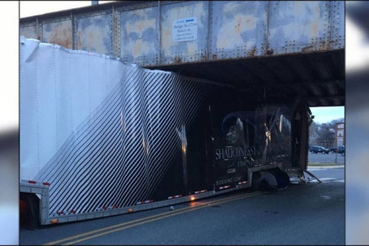 В полицейском отчете указано, что фура перевозила автомобили из Флориды в Делавэр. Водитель грузовика подумал, что сможет проехать под мостом на пути следования, но оказался неправ.