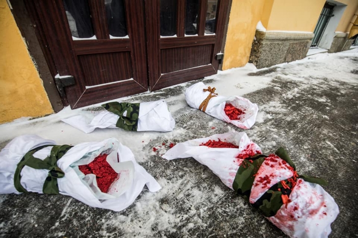 "Шесть женщин в противогазах атаковали военкомат Ленинградской области, что находится в Санкт-Петербурге, попробовав поставить на воинский учет грудных младенцев. Однако, в пеленках, перевязанных георгиевскими лентами, вместо младенцев было сырое мясо", - написала активистка.