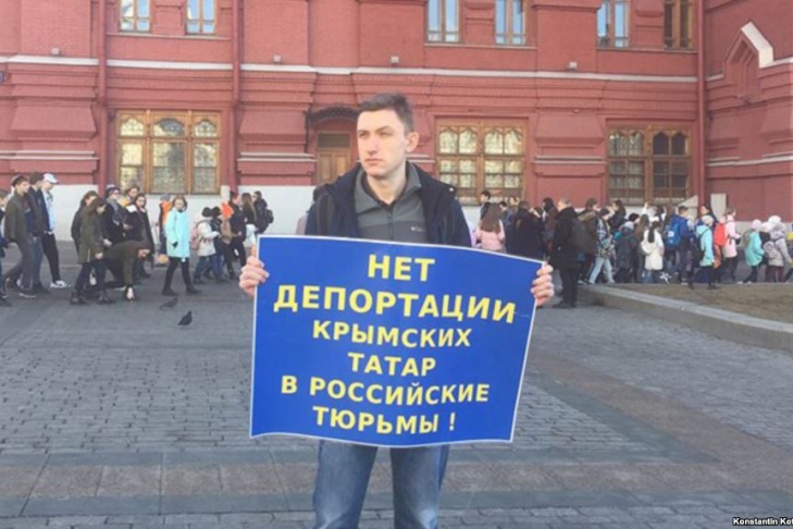 В центре Москвы на Манежной площади гражданский активист из России Константин Котов проводил одиночный пикет против перемещения арестованных в Крыму крымскотатарских активистов в Россию.