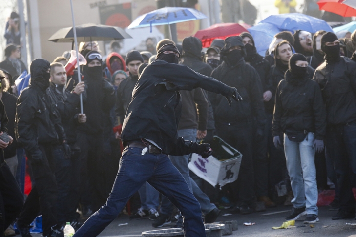 Неизвестные в масках забрасывали полицейские машины бутылками с зажигательной смесью. Два автомобиля злоумышленники сожгли.