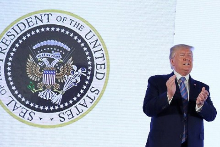 Во время выступления президента США Дональда Трампа перед сторонниками в Вашингтоне на экране, который находился за его спиной, появилась измененная президентская печать - орлу дорисовали еще одну голову и "вложили" в когти клюшки для гольфа.