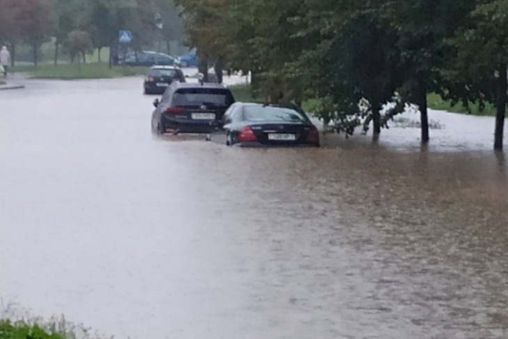 Водители в столице Беларуси сообщают о плохой видимости. А как можно увидеть на фотографиях, на некоторых улицах вода доходит до окон автомобилей.