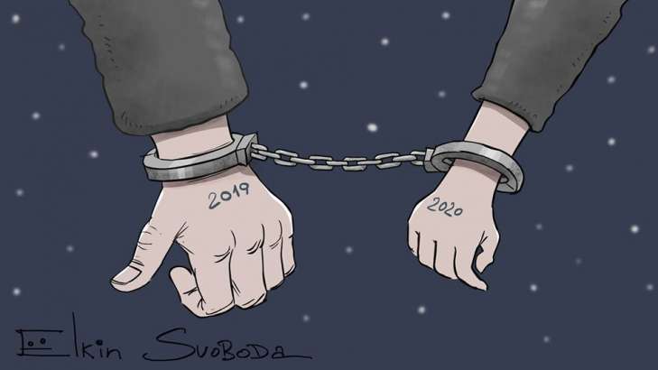 Меткой карикатурой изобразил российский художник Сергей Елкин приход 2020 года в России.