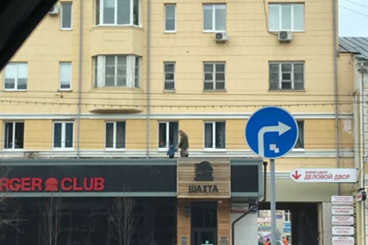 В районе трех часов дня на крыше дома №45 на Коммунистической улице был замечен мужчина, который гулял с двумя маленькими детьми. Крыша располагалась на уровне второго этажа — квартиры в доме находятся над кафе. Пока троица ходила по козырьку, из окна за ней наблюдала женщина, вероятно, мама детей.