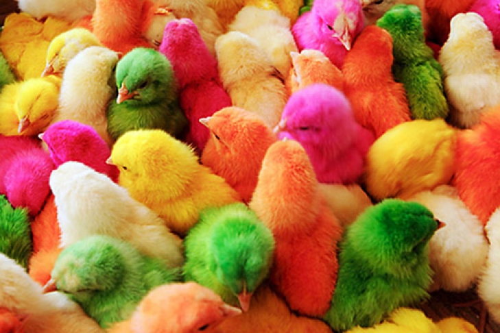 Отметим, искусственное окрашивание птицы разработано учеными с целью отследить ее передвижение в природе. Прогнозируется, что разноцветные птенцы «захватят» азиатские рынки, где ярко-розовые или ярко-зеленые цыплята привлекают намного больше покупателей. В этом смог убедиться фотограф Десмонд Каванахи на одном из рынков Ирана.