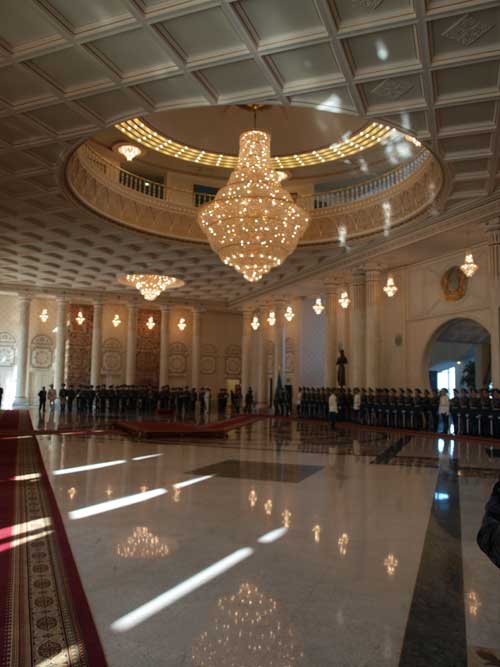 Примечательны также столица и главное здание страны. Хотя, пожалуй, их стоило бы называть в обратном порядке, поскольку президентский дворец, так сказать, венчает архитектурный образ Астаны. Таких зданий в Украине просто нет. А уж наша Администрация не идет ни в какое сравнение с этим, в самом деле, дворцом. Нет, он не изукрашен резными башенками и вокруг него не прогуливаются придворные дамы и кавалеры. Это дворец двадцать первого века, он снабжен скоростными лифтами, системами кондиционирования воздуха, сетями коммуникаций и прочим хай-теком. Внутреннее убранство роскошно, блещет позолотой и хрусталем, подчеркнутыми современными скульптурами. Все это тонко увязано с особенностями национальной эстетики с явно мусульманским оттенком. Само здание величественно и монументально, хотя, не так уж и оригинально. Чем-то на него похож Украинский дом в Киеве. Но лишь на столько, на сколько тень похожа на реальный объект. Дворец горделиво отмежевался километровым пространством от всех остальных. Эта буферная зона настолько бросается в глаза, что окружающий его кованый забор практически незаметен. «Акорда» подчиняет себе весь архитектурный образ Астаны. Впрочем, построенной именно для того, что бы президентский дворец не стоял в голой степи. Ведь до 1997 года существовал лишь город Акмола на левом берегу реки Ишим, и только волей Нарсултана Назарбаева появилась Астана на обоих берегах.