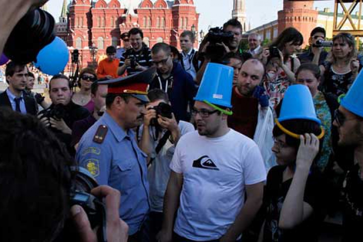Как сообщили «Багнету» активисты Межрегиональной Общественной организации «Справедливость», в столице РФ прошла акция протеста против использования правительственных «мигалок». Организатором акции выступила Федерация автовладельцев России, при активном участии правозащитников МОО «Справедливость». Акция протеста общественников, была обставлена как экскурсия или прогулка. Протестанты шли от Манежной площади далее к Охотному ряду и т.д. – по одному из маршрутов, где ездят высокие российские чиновники на автомобилях с «мигалками». А чтобы общественников заметили «высокие лица» из машин с «мигалками», протестанты одели себе на головы кто синие ведра, кто синие пластиковые стаканчики и т.д. Таким образом участники акции имитировали свои, «народные» так сказать спецсигналы и «мигалки».