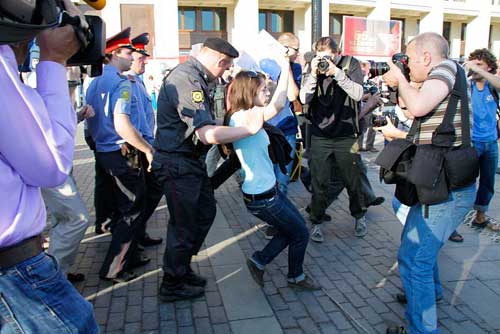 Московская милиция почему-то очень агрессивно отреагировала на происходящее. По сообщению активистов «Справедливости», в акции протеста приняли активное участие всего около 40 человек. При этом, милиция задержала 10 протестантов. То есть, был задержан каждый четвертый участник акции. После того, как правозащитники вызвали представителей ГУВД Москвы в тот райотдел милиции, где содержали участников акции протеста, задержанных отпустили, а милиционеров препроводивших общественников в отделение, пообещали наказать.