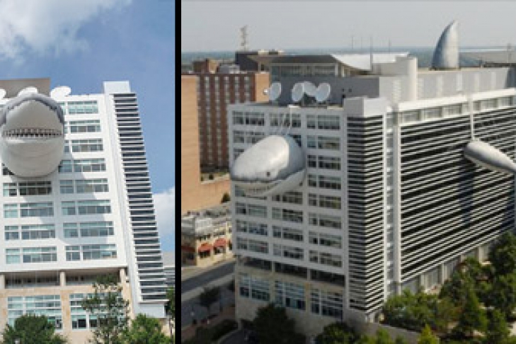 Главный офис телеканала Discovery в Мэриленде необычно задекорировали под огромную акулу. При помощи канатов к гигантскому зданию прикрепили пять надувных частей уникального «существа»: голову, хвост, верхний и два боковых плавника.