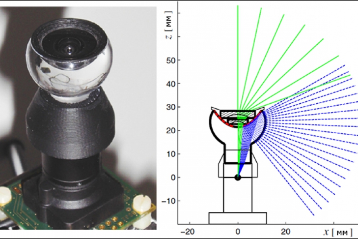 В своей схеме учёные предусмотрели две оптические траектории: внешняя часть изображения формируется с помощью выпуклой отражающей поверхности, а центральная область камеры собирает лучи через линзы. Система, масса которой не превышает 40 г, соединяется с USB-камерой с КМОП-матрицей. Камера обеспечивает съёмку с частотой до 80 кадров в секунду с разрешением по вертикали в 480 пикселов.