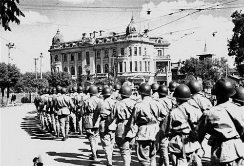 Советские воины в освобожденном Харбине, русской столице Китая.