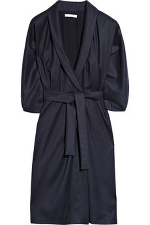 Темно-синее платье с запахом сшито из тонкой шерсти. Носите с туфлями или ботильонами на высоком каблуке, сумками-конвертами. Дополняйте образ неброскими украшениями.