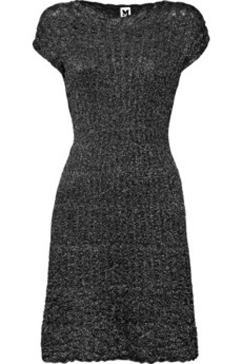 Серое платье, связанное из шерстяной пряжи с добавлением металлической нити, выглядит буднично. Используйте броские аксессуары, чтоб освежить образ.