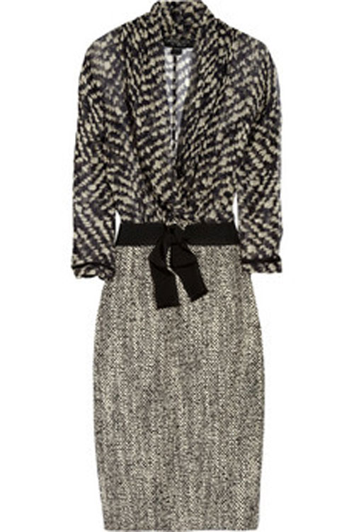 Твид – одна из самых модных тканей сезона. Подробнее об этом тренде вы прочтете в следующих публикациях «Багнета». В этой модели платья твид сочетается с шелком в тон. Вы можете носить поверх жакет или жилет. Аксессуары выбирайте классические.