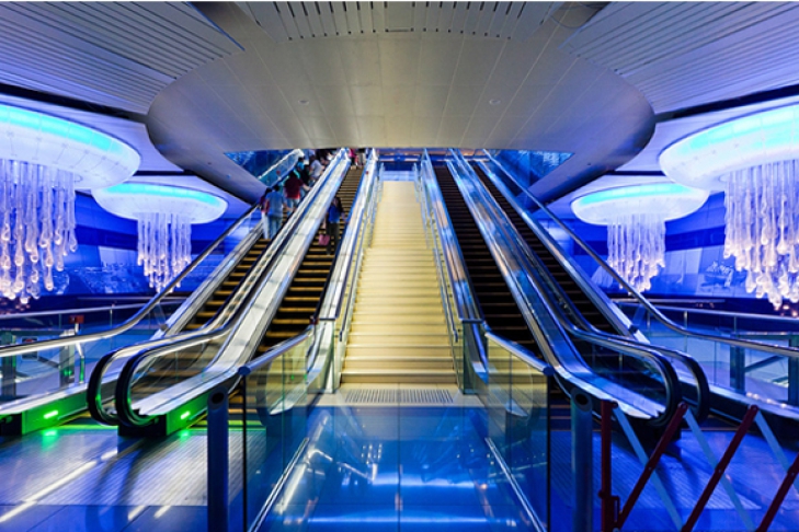 Дизайн станций дубайського метро полностью соответствует концепции проекта, где обыгрываются четыре элемента: земля, вода, огонь и воздух.