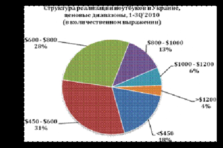 При этом средняя цена устройства составила около 4 850 грн. Наиболее привлекательная стоимость портативных компьютеров находилась в диапазонах 3 500 грн. – 5 000 грн. и 5 000 грн. – 6 500 грн., их приобрели 38% и 27% покупателей соответственно. Бюджетные устройства (нетбуки и недорогие акционные ноутбуки) стоимостью менее 3 500 грн заняли 19%, а дорогостоящие изделия стоимостью более 6 500 грн. - 16% продаж.