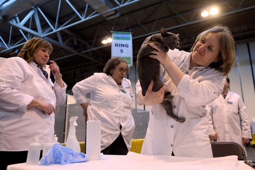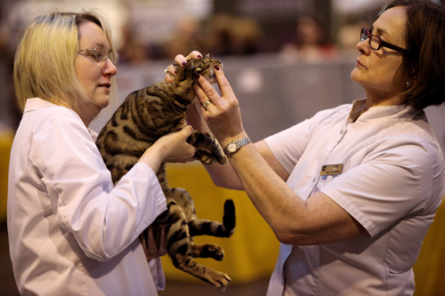 Осмотр кошки на выставке «Supreme Cat Show» 20 ноября в английском городе Бирмингем