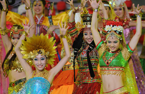 Выступление танцоров в национальных костюмах стран-участниц Азиады на церемонии открытия игр, которая впервые в истории крупных международных состязаний прошла вне стен спортивного сооружения