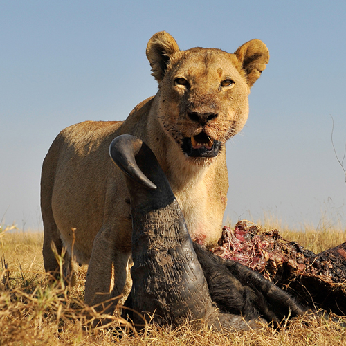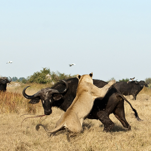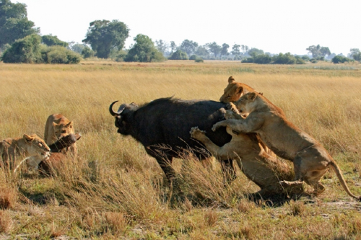Львы выбирают момент всегда тщательно и особо не рискуют. Сначала это проба сил. Но когда жертва выбрана, они ее отгоняют от стада. Процесс охоты долгий, но львы терпеливы – одинокий лев хороший охотник, а прайд это грозное оружие. Действуя заодно прайд может совладеть с животным, с которым не справился бы одиночка. Заваливание добычи – это самый ответственный момент охоты, буйвол может легко нанести льву смертельный удар, но львов много, и у жертвы нет шансов.